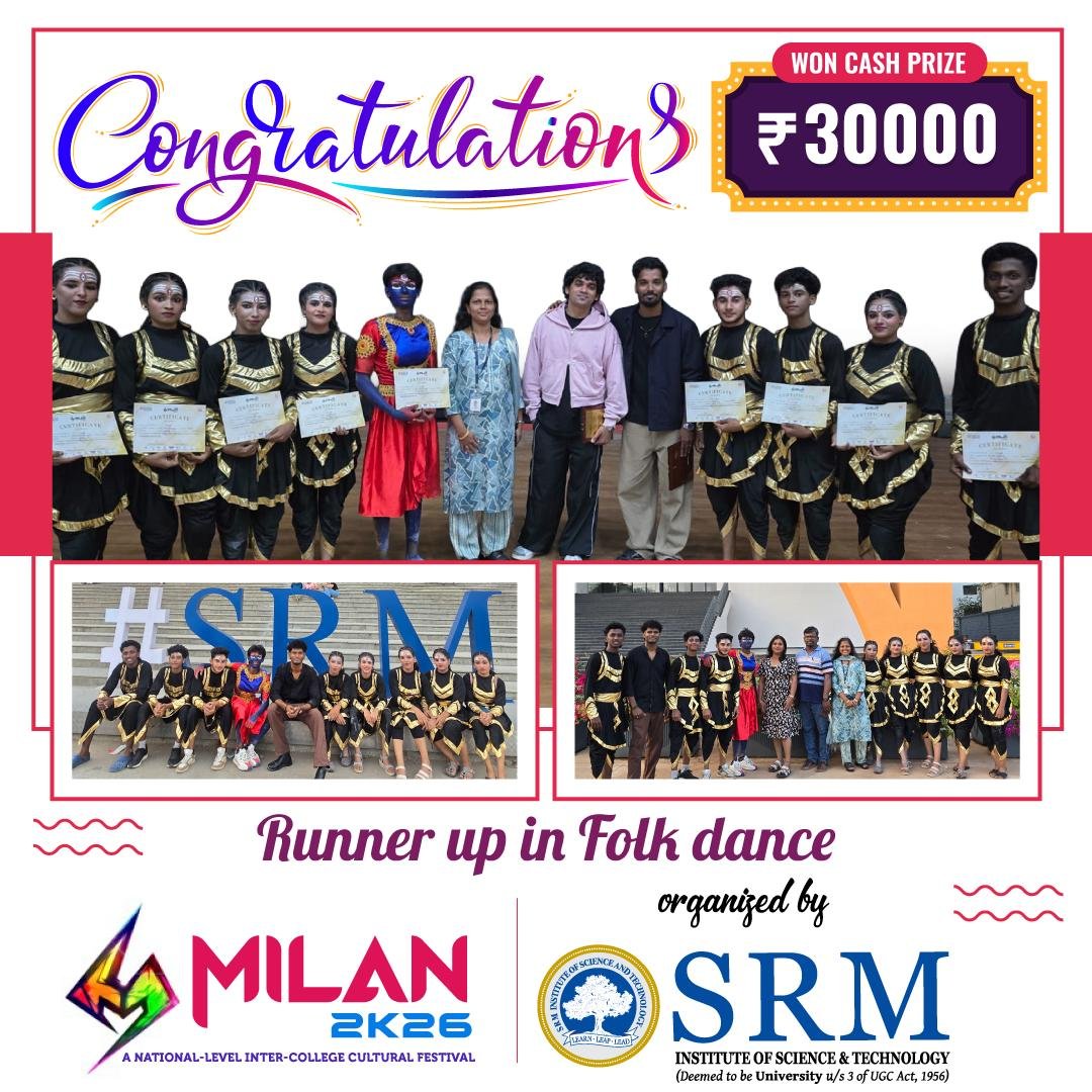Rohini dance team secured Runner-Up with case prize Rs.30000 at Milan26 held at SRM University Chennai fron 19/2/2026 to 22/2/2026. This is truly a proud and memorable moment for all of us!
